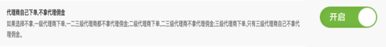 默認是關閉狀態。開啟后,一級代理商下單,一二三級代理商都不拿代理商傭金;二級代理商下單,二級和三級代理商不拿代理傭金;三級代理商下單,只有三級代理商自己不拿代理商傭金。