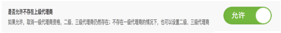 默認是不允許。開啟后,取消一級代理商的資格。二級和三級代理商仍然存在。 沒有的一級代理商的情況下,同樣可以設置二級,三級代理商。