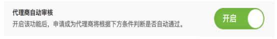 開啟該功能后,申請成為代理商將根據下方條件判斷是否自動通過。 選擇關閉,申請成為代理商需要后臺手動審核,審核通過后,會員成為代理商。 代理商設置中需要設置允許不存在上級代理商,才能設置是否自動審核; 開啟自動審核后,可以設置自動審核后成為代理商的返傭比例和審核條件;