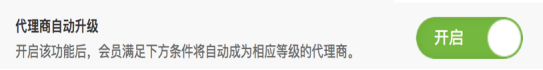 默認是關閉,不升級狀態。代理商設置中需要設置允許不存在上級代理商,才能設置是否自動升級。開啟按鈕后,開啟該功能后,會員滿足下方條件將自動成為相應等級的代理商。 開啟自動升級后,可以設置自動升級代理商等級后,代理商的返傭比例和升級條件; 會員符合條件后將自動成為該等級的代理商(如果代理模式選擇僅支持地區代理商,不會自動升級)。當以下升級條件選擇全部選擇“或”時,只要滿足其中一個條件就能升級。選擇“與”時,則該條件必須要滿足才能升級。
