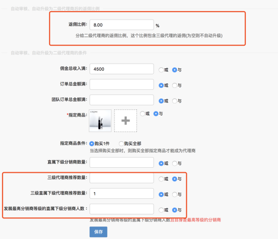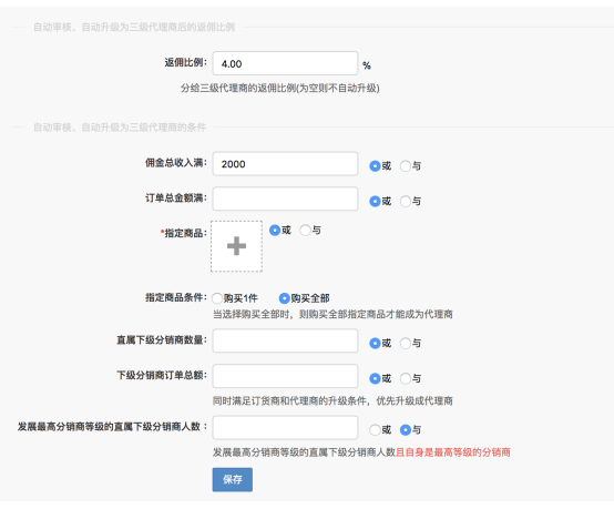 這兩個條件只針對三級代理商升二級和二級代理商升一級。 代理商推薦數量:按照就近原則,計算該代理商推薦平級的人數,人數滿足,則自動升級二級代理商或者三級代理商。通俗點理解就是增加平級推薦數量,當三級代理商推薦了下級成為和自己同級別的三級代理商就可以升級成為二級代理商。二級同理。 直屬下級代理商推薦數量:一定要直屬下級,直屬下級要是同級別的代理商,為0為空不會升級。只有代理商的身份才會升級。 發展最高分銷商等級的直屬下級分銷商人數:當前最高等級分銷商的直屬下級分銷商人數,且和自己是同級別的分銷商達到設置數量,則會升級。 這里說下,自動升級條件里有返傭比例設置,如果開啟了自動升級的按鈕,返傭比例是必須要設置的,不設置,即使升級條件滿足了也不會升級。 注:只有代理商才有資格滿足自動升級條件,會員,分銷商,門店,員工,訂貨商,均不可以,但是被推薦成為平級代理商的身份可以是會員,分銷商。