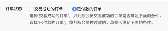 傭金總收入滿:當分銷商傭金達到設置金額后,則會升級。 訂單總金額滿:當購買商品的訂單金額達到設置金額后,則會升級。 購買指定商品(一件或購買全部):商家可設置指定的商品,會員購買指定商品后,則會自動升級成為代理商。選擇購買指定商品時增加“指定商品條件”購買1件或購買全部的選項。 當設置購買一件時,買家購買任意一件指定商品即滿足條件(默認購買一件) 當設置購買全部時,買家必須購買全部全部指定商品才能滿足升級條件。 下級分銷商訂單總額:當會員的下級分銷商購買商品的訂單總額達到設置金額后,則會升級。統計的是三級以內的分銷訂單總和。 以上這幾個條件,升級是有前置條件的: 要根據選擇的“訂單狀態”:“交易完成的訂單”或“已付款的訂單”來判斷是否滿足條件。 訂單狀態: