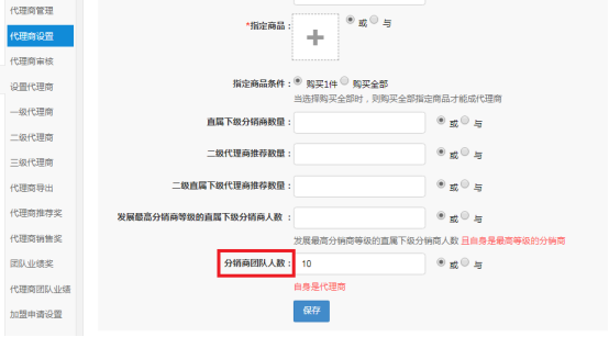 操作步驟: 總部后臺→會員→代理商→代理商設置:多了一個判斷條件“分銷商團隊人數”。①升級成三級代理商條件:升級的身份必須是分銷商,且分銷商下面3級分銷商總人數大于或等于指定值就可以升級,自身不算;②升級成二級代理商和一級代理商條件:升級者的身份必須是代理商,且分銷商團隊總人數大于或等于指定值就可以升級,如果自身是分銷商的話也算;