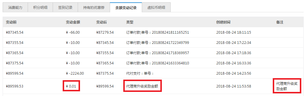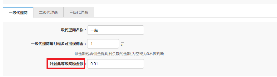 代理商等級增加“升到此等級獎勵金額”,成為相應等級代理商(充值、升級、手動設置)會獎勵一定金額(參考分銷商等級獎勵金額)。