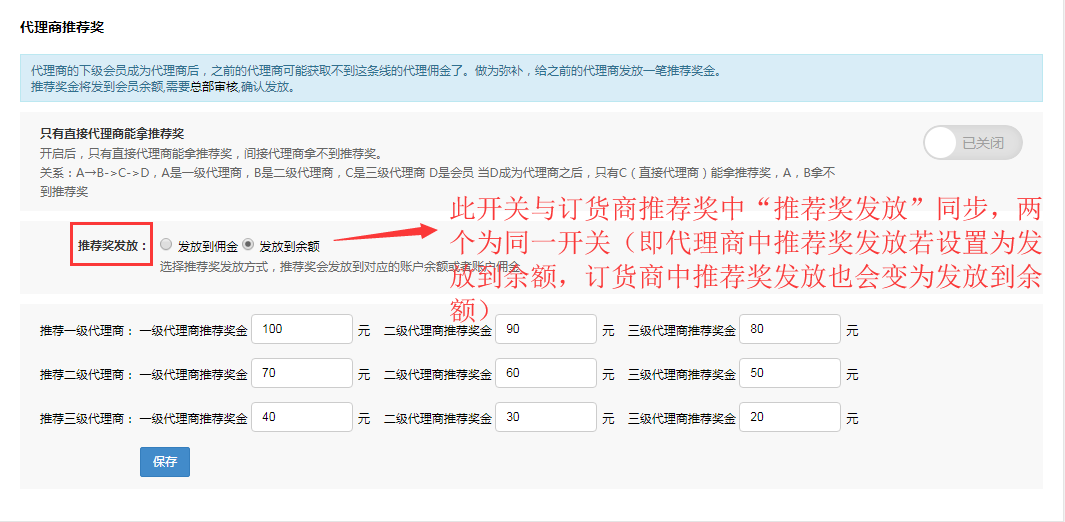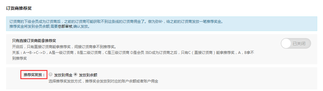 ? 總部后臺→會員→訂貨商:訂貨商推薦獎,增加“只有直接訂貨商能拿推薦獎”的開關,開啟后,只有直接訂貨商能拿推薦獎,間接訂貨商拿不到推薦獎。 關系:A→B->C->D,A是一級訂貨商商,B是二級訂貨商,C是三級訂貨商 D是會員 當D成為訂貨商之后,只有C(直接訂貨商)能拿推薦獎,A,B拿不到推薦獎。