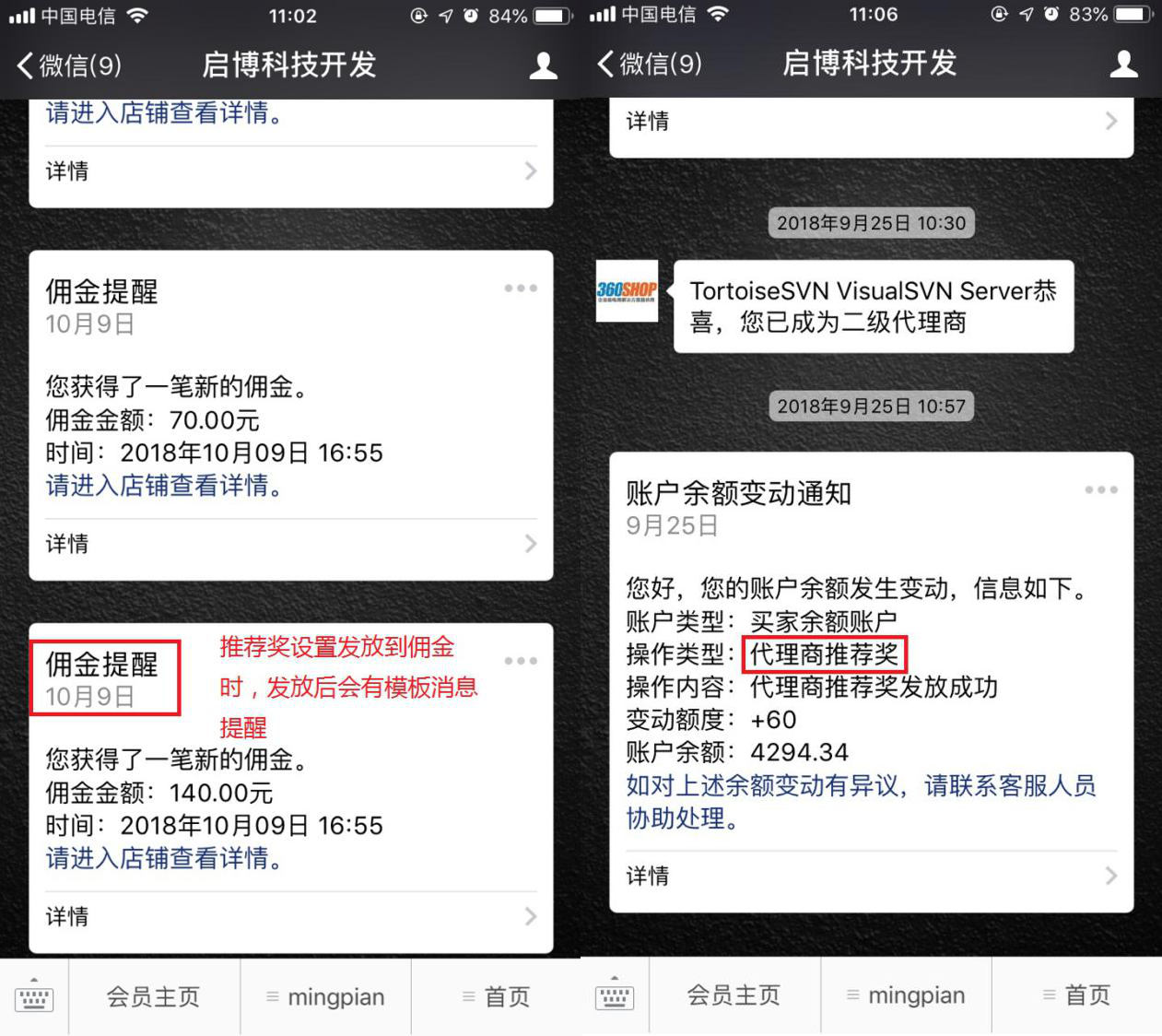 代理商或訂貨商獲得推薦獎后有模板消息提醒