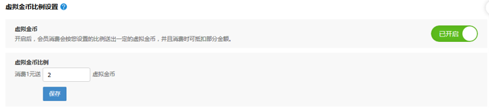 ① 虛擬幣比例:商家可根據自我需求,選擇是否啟用消費送虛擬幣功能,開啟后,會員消費會按您設置的比例送出一定的虛擬金幣;