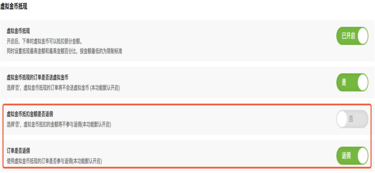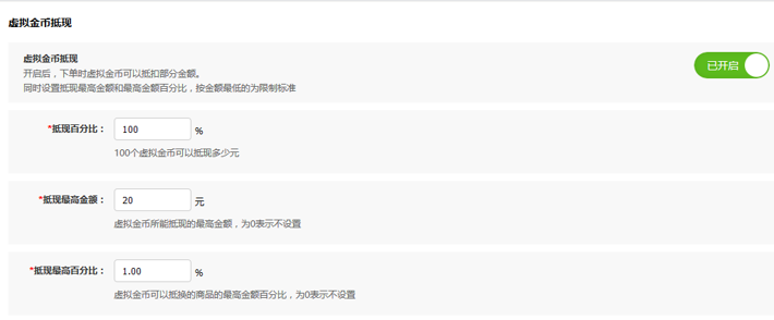 虛擬幣抵現:商家可根據自我需求,選擇是否啟用虛擬幣抵現功能,開啟后,下單時虛擬金幣可以抵扣部分金額;