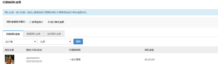 ? 團隊業績:統計的是一條線上最高級別代理商的團隊代理商傭金或訂單總金額總和;