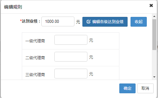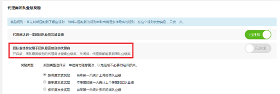默認統計的是一條線上最高級別代理商的團隊代理商傭金或訂單總金額總和,開啟后可設置不同等級不同規則;不同等級達到設置的規則之后獎勵對應的業績獎。