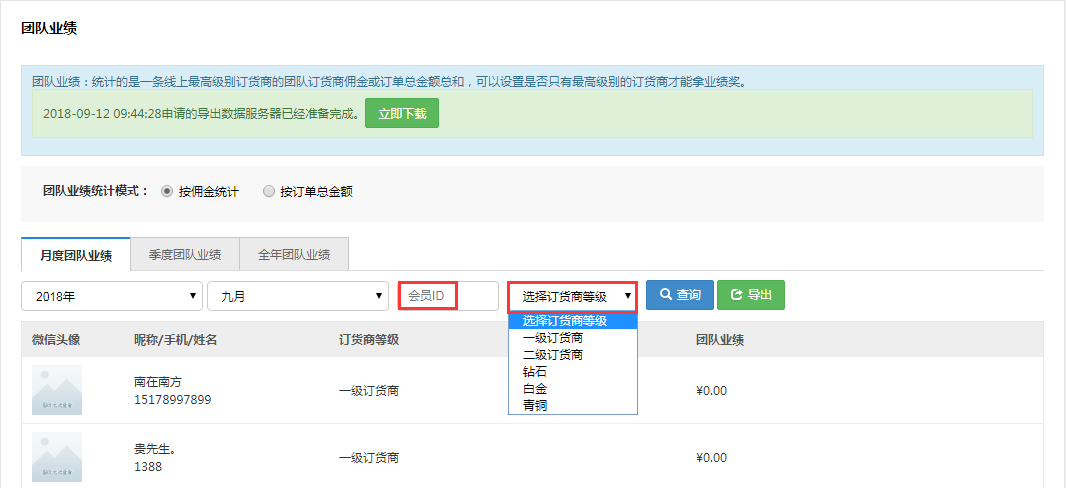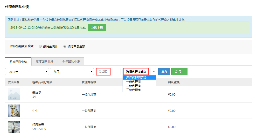 代理商和訂貨商團隊業績可以按照等級和會員ID查詢和導出