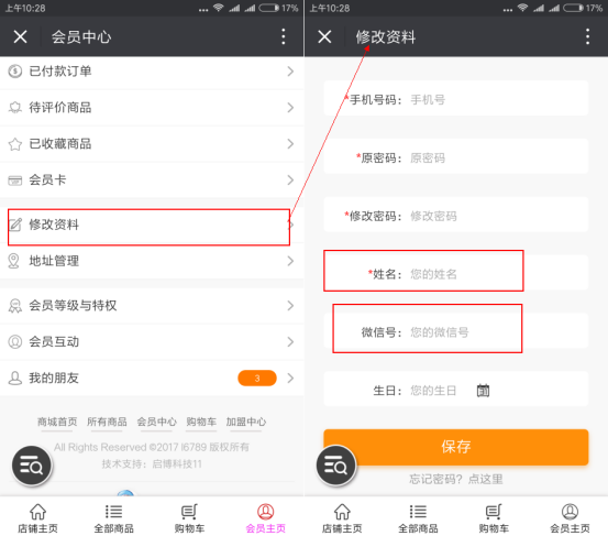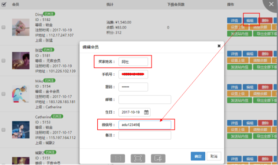 2.獲取訂貨商名片時,上面的微信號是獲取的會員“修改資料”填寫的微信號或者商家在后臺編輯會員信息時填寫的微信號,茲授權獲取的是微信昵稱,當訂貨商有姓名時,優先顯示姓名,再顯示微信昵稱。