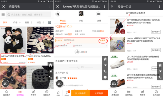 ① N件商品多少錢,如一個(gè)頁面20個(gè)商品,隨意購買3件商品,固定金額是99元,會(huì)員可以隨意去拼湊這3件商品 ② 買家在商品池內(nèi)選擇一定件數(shù)的商品,滿足活動(dòng)條件后將享受活動(dòng)優(yōu)惠;