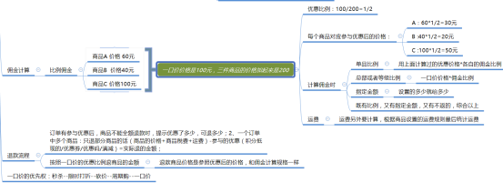 ③ 當(dāng)買家一筆訂單內(nèi)選購的商品件數(shù)超出活動(dòng)規(guī)則限定的件數(shù),加入購物車結(jié)算時(shí)系統(tǒng)根據(jù)計(jì)算商品金額由高到低排列,優(yōu)惠規(guī)則優(yōu)先滿足價(jià)格最高的商品,其余商品用戶原價(jià)支付; ④ 單筆訂單內(nèi),如果滿足多次活動(dòng)規(guī)則,則買家享受多次優(yōu)惠,例如abc3件商品50元,買家這時(shí)候買了aabbcc6件商品,則只需支付100元即可全部拿走 ⑤ 傭金計(jì)算,運(yùn)費(fèi),退款流程如下: