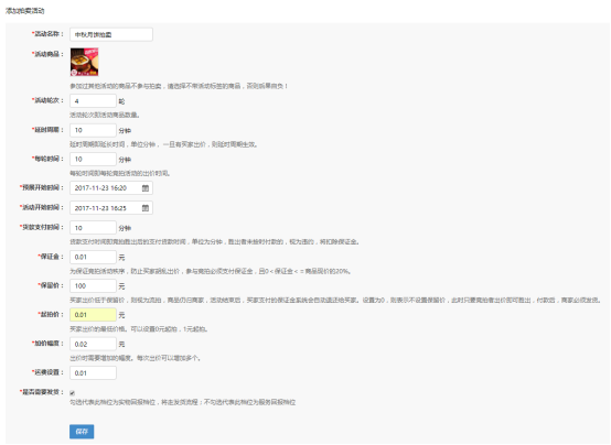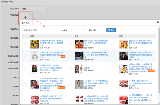 1)活動商品:已經(jīng)參與營銷活動的商品不能再參與拍賣活動,添加商品時,已經(jīng)參與活動的商品都會有相應(yīng)的活動標(biāo)注,方便商家選擇拍賣商品;