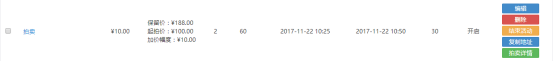2)活動輪次:就是商家可以設(shè)置幾輪活動,也就是活動商品的數(shù)量; 3)延時周期:即延長時間,一旦有買家出價,則延時周期生效,就是有人出價后,如果在延時周期內(nèi)沒人再出價,那么該輪活動結(jié)束,如果在延時周期內(nèi)有人出價,那么該輪活動一直這樣循環(huán),直至延時周期內(nèi)沒人出價,該輪活動結(jié)束; 4)每輪時間:即每輪競拍活動的出價時間。 ?如果延時周期設(shè)置為0,那么在每輪時間內(nèi),出價最高的將勝出。 ?如果延時周期不設(shè)置0,活動沒人競價時,本輪活動會根據(jù)每輪時間來結(jié)束活動,如果有人出價了,就會根據(jù)延時周期的循環(huán)來決定活動的結(jié)束。 5)預(yù)展開始時間: ?預(yù)展時間開始前,商家可以編輯、刪除、結(jié)束拍賣活動;
