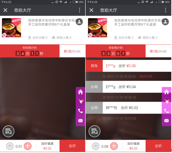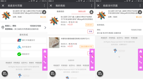 6)活動開始時間:活動開始后買家支付過保證金的可以點擊出價大廳參與商品的出價競選,沒交保證金的買家可以先交保證金在參與出價競選; 7)貨款支付時間:即競拍勝出后的支付貨款時間,單位為分鐘。勝出者未按時付款的,視為違約,將扣除保證金; 8)保證金:為保證競拍活動秩序,防止買家胡亂出價,參與競拍必須支付保證金,且0<保證金<=商品現(xiàn)價的20%;假如拍賣有2輪,買家A在第一輪時付了保證金并參與競拍,競拍勝出后支付貨款時會減去保證金的金額,第一輪保證金減去后,A再參與該活動的第二輪拍賣則還需要再次繳納保證金;如果A在第一輪的保證金沒被減去,那么A參與第二輪競拍時不需要在繳納保證金。 9)保留價:買家出價低于保留價,則視為流拍,商品仍歸商家,活動結(jié)束后,買家支付的保證金,系統(tǒng)會自動退還給買家。設(shè)置為0,則表示不設(shè)置保留價,此時只要競拍者出價即可勝出,付款后,商家必須發(fā)貨。 10)起拍價:買家出價的最低價格。可以設(shè)置0元起拍,1元起拍。設(shè)置0元起拍的話,買家拍價時會自動加上“加價幅度”; 11)加價幅度:出價時需要增加的幅度,每次出價可以增加多個幅度。 12)拍賣支付時目前只能用微信、支付寶和銀聯(lián)支付哦。