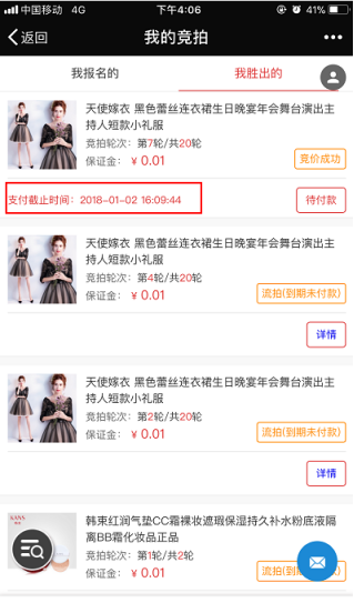 買家收到勝出消息后,可進商城在會員中心→拍賣:我的競拍頁面選擇“我勝出的”便可查看到我在拍賣活動中拍到的商品,并可以看到支付截止時間(本輪活動結(jié)束時間加上支付貨款的時間),這個時間會有0至15分鐘的緩存時間。