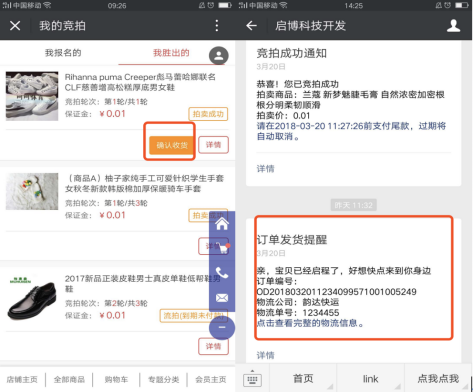 手機端增加確認(rèn)收貨按鈕和拍賣訂單發(fā)貨提醒模板消息。