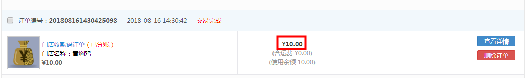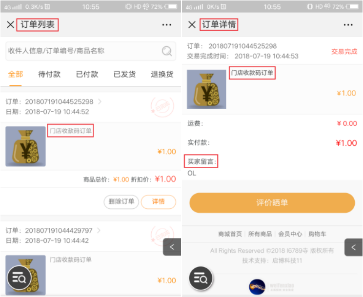 門店收款碼訂單在手機(jī)端訂單列表及訂單詳情中顯示如下: