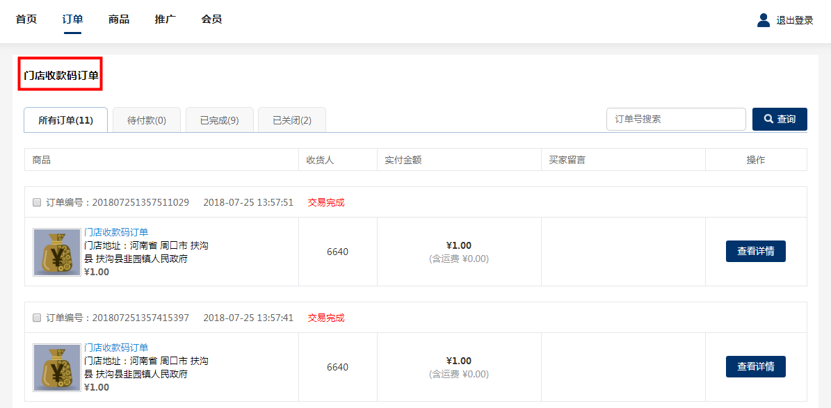 總部后臺(tái)門店收款碼訂單顯示如下: