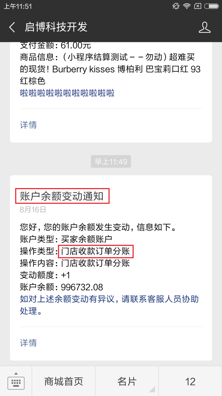 門店手機(jī)端也會(huì)收到相應(yīng)余額變動(dòng)信息: