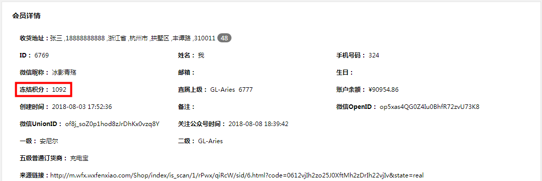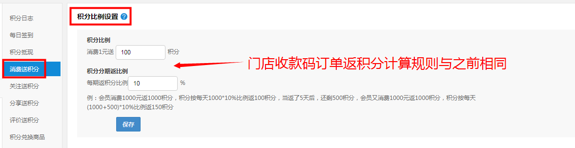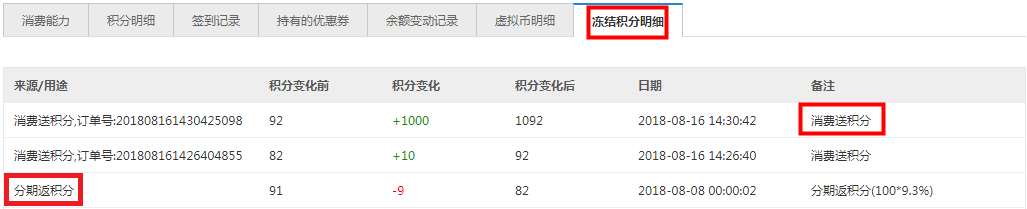 門店收款碼訂單與其他訂單一樣,消費(fèi)一定金額會(huì)贈(zèng)送相應(yīng)積分,也可分期返積分,消費(fèi)分期返積分計(jì)算規(guī)則與之前相同。設(shè)置分期返積分比例后,消費(fèi)送的積分將返還到會(huì)員詳情中的凍結(jié)積分中,然后按照相應(yīng)比例分期返積分。