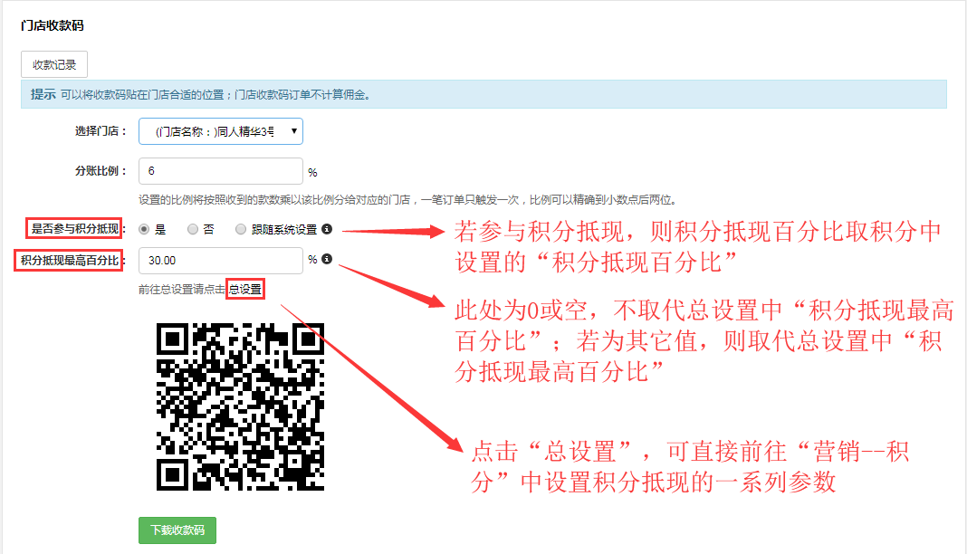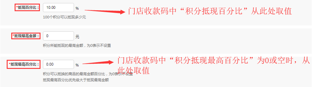 門店收款碼中新增設(shè)置項(xiàng)“是否參與積分抵現(xiàn)”、“積分抵現(xiàn)最高百分比”,可設(shè)置門店收款碼是否支持積分抵現(xiàn)
