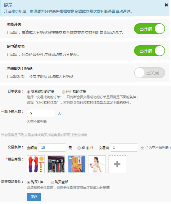 分銷商自動審核設置:開啟該功能后,申請成為分銷商將根據交易金額或交易次數以及購買指定商品判斷是否自動通過。當會員滿足下列交易條件或購買指定商品時即可成為分銷商,也可以設置為達到交易多少金額或者多少比訂單。 也可以設置交易多少金額與多少訂單才能達到自動申請資格。開啟此功能后,可以開啟“免申請”功能,開啟后會員符合用戶設置的條件將會自動成為分銷商。
