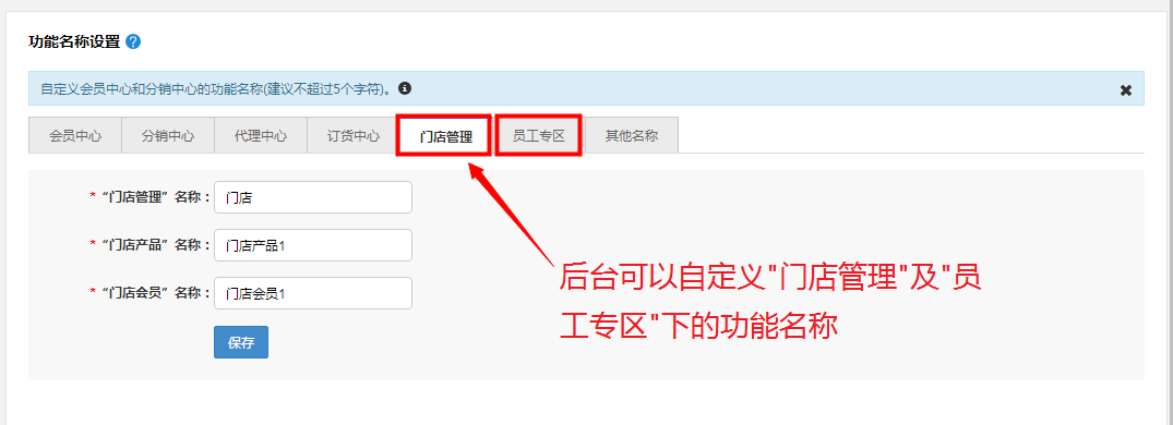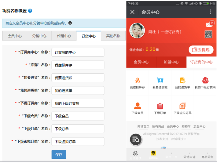 功能名稱設置:商家可自定義會員中心、分銷中心、代理中心以及其他名稱的功能名稱。其他名稱包括:一級、二級、三級、下級、積分等名稱的個性修改。
