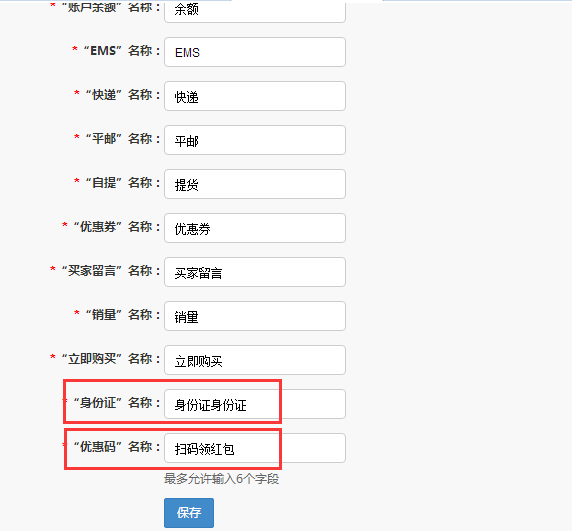 優惠碼、購物上傳身份證可以自定義功能名稱
