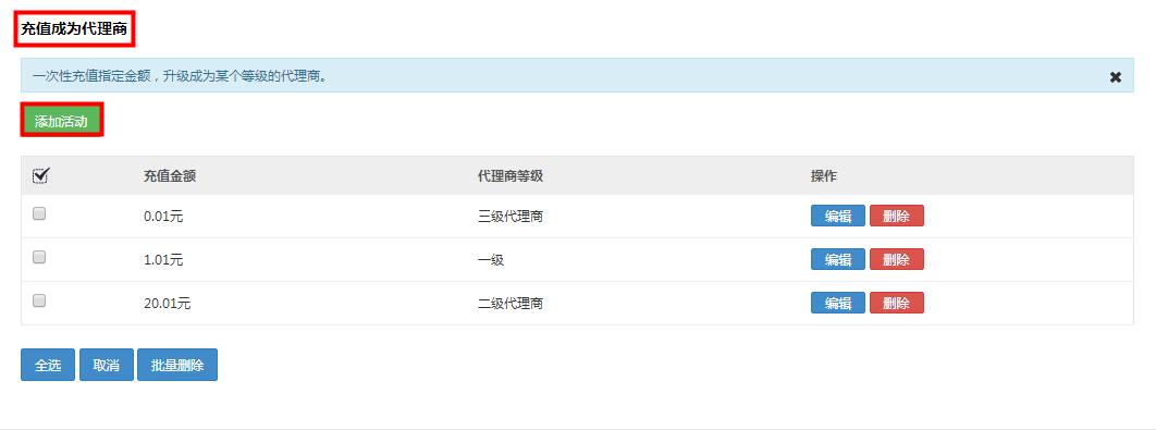 充值不成功限制條件:1.“不允許不存在上級代理商”,無法充值成為其他等級代理商;2.不允許代理商自動升級;3.已經是訂貨商的不能成為代理商;4. 僅支持區域代理商模式,不能升級;5.區域代理商不能升級;6.當前等級大于升級等級,不允許升級。
