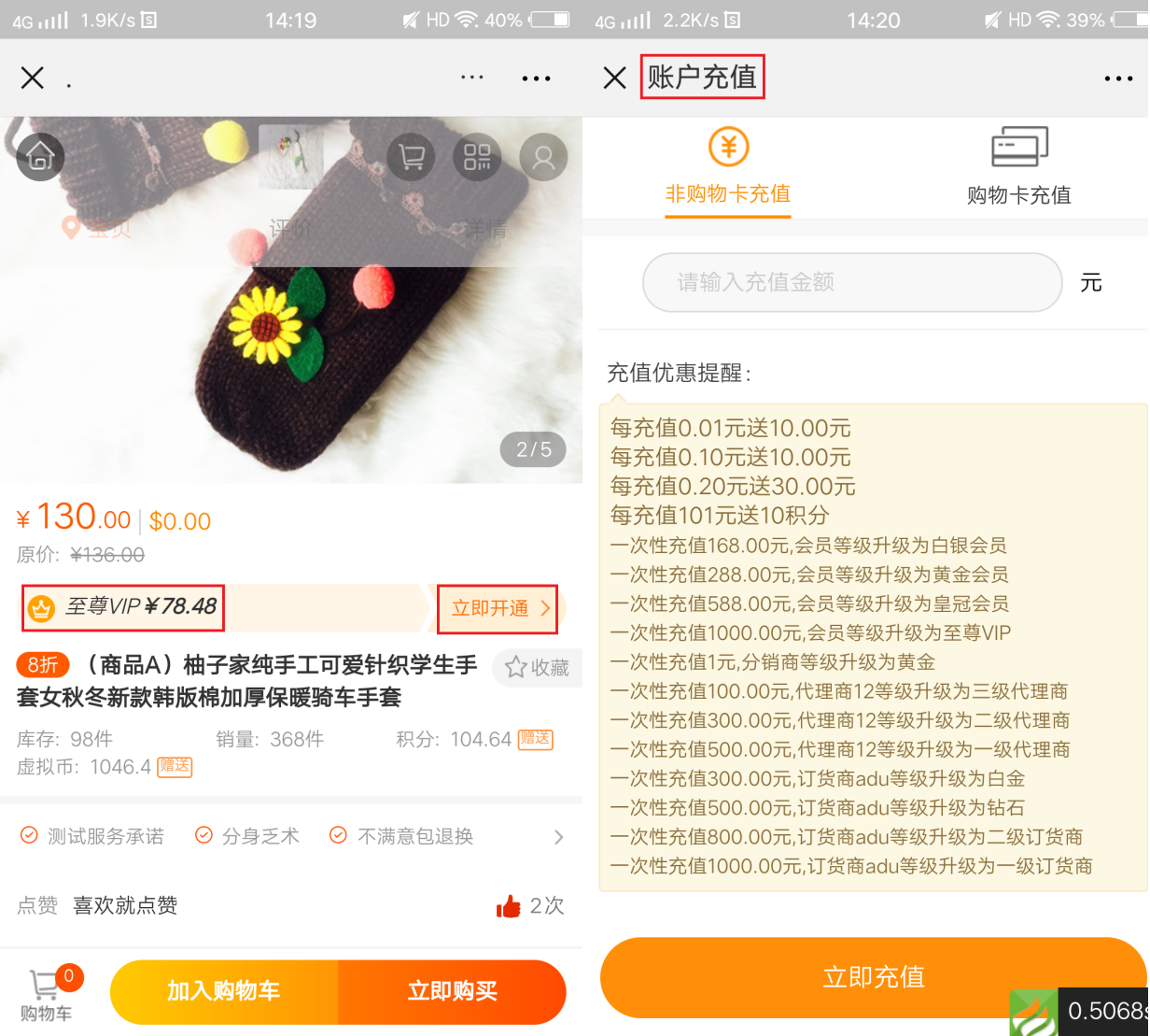 手機端商品詳情頁顯示最高等級會員價(充值升等級中設置的最高等級會員),點擊“立即開通”,直接進入賬戶充值頁面;該會員價只顯示充值升等級中設置的最高等級會員價,已經是最高等級的會員不會顯示此會員價;周期購、秒殺、拼團商品詳情頁不顯示此會員價。