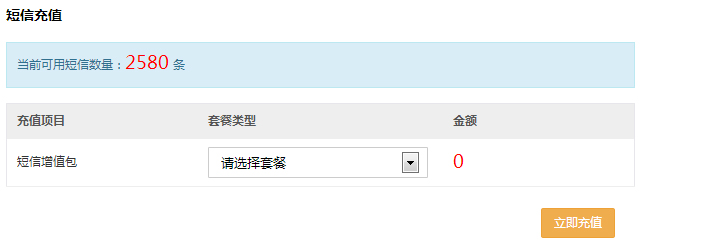 短信充值:可以看到可用的短信條數(shù)量,可以選擇套餐進行短信條數(shù)的充值。