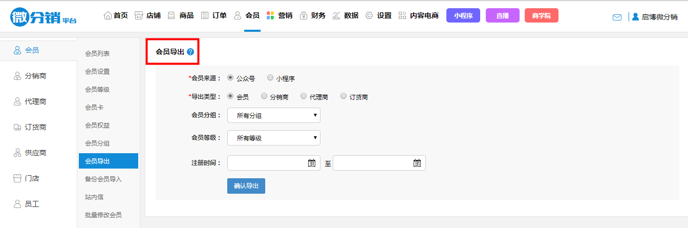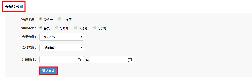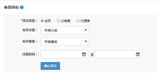 會員導(dǎo)出:可以根據(jù)會員、分銷商、代理商的一個注冊時間來進(jìn)行一個范圍導(dǎo)出。不選擇時間就導(dǎo)出全部