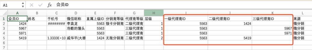 優(yōu)化導(dǎo)出全部下級可以顯示下級的一級代理商ID,二級代理商ID,三級代理商ID