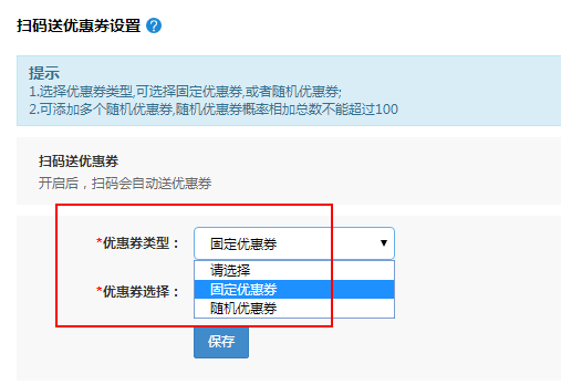 ① 掃碼送優惠券加一個配置項,可以選擇固定優惠券或者隨機優惠