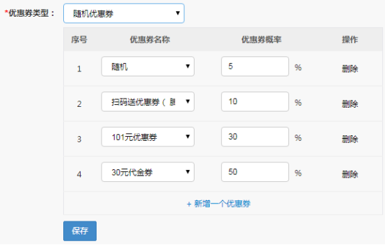 ② 當選擇隨機優惠券之后,加一個優惠券多選按鈕,選中優惠券后面跟上對應抽中概率,掃碼后,根據概率發放隨機優惠券