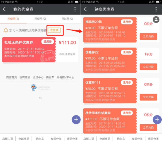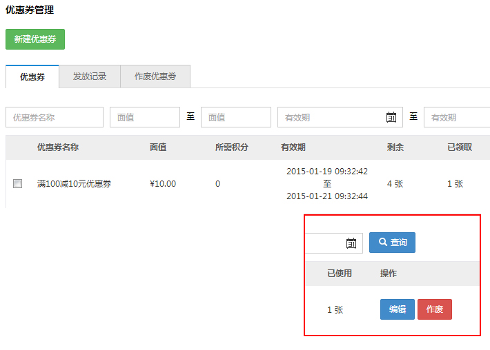 優惠券管理:可以看到所有的優惠券,發放優惠券的記錄,作廢的優惠券。可以根據優惠券名稱,面值,有效期進行查詢。可以編輯優惠券的屬性,也可以作廢優惠券。