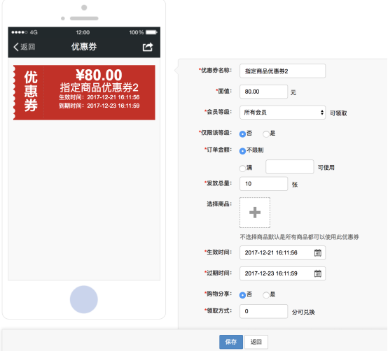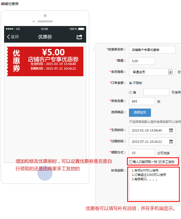 用戶可直接編輯已有的優惠券信息,在增加和修改優惠券時,可以設置優惠券是否是自行領取的還是由商家手動發放的