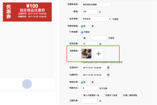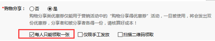 購物分享送優惠券可以設置每人只能領取一張: 添加/編輯優惠券時,購物分享選擇“是”時,可以設置每人限領一張,選中后,購物分享送優惠券,每個只能領取一張。