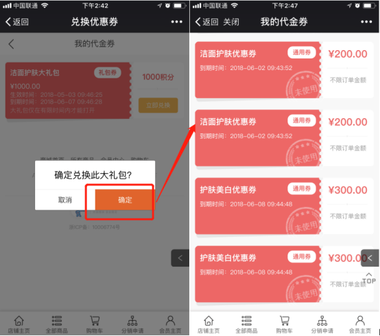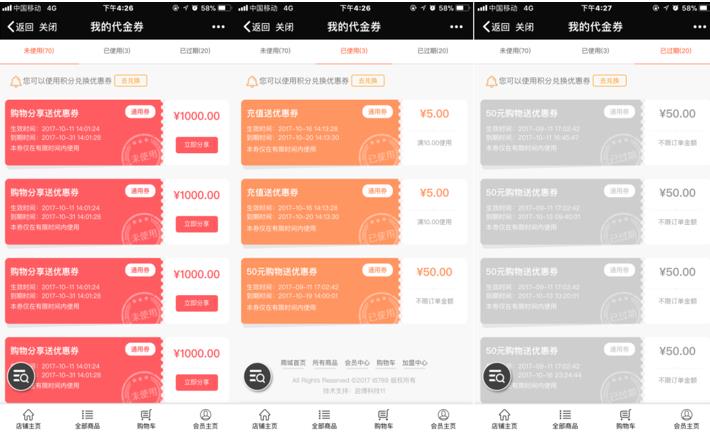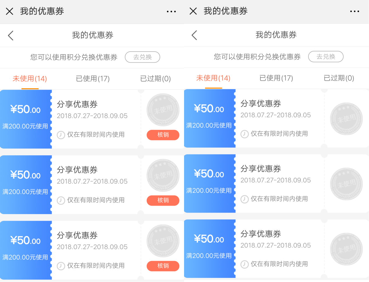 如果創建的購物分享優惠券設置的每人只能領取一張,分享人可以有多張,被分享人只能有一張。