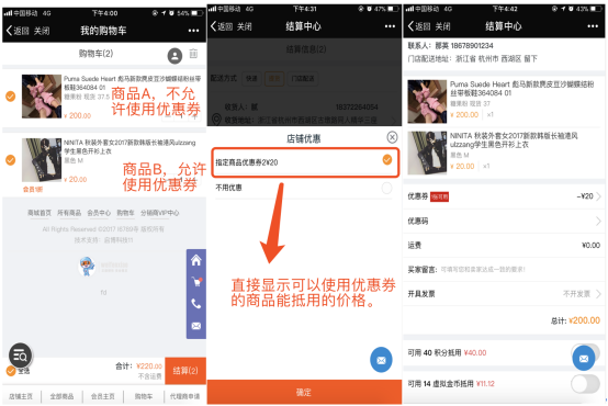 當客戶在購買多件商品時,比如A商品、B商品, A商品設置了不允許使用優惠券,B是允許的。可以使用優惠券減免B商品的價格。