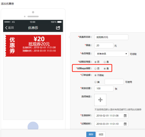 操作步驟: 總部后臺→營銷→優惠營銷→優惠券管理:新建/編輯優惠券時,增加“僅限APP領取”的選項,默認選擇否。當選擇是時,該優惠券只能在APP中才能兌換領取。(如果是消費送優惠券,則微信中還可以收到該優惠券)