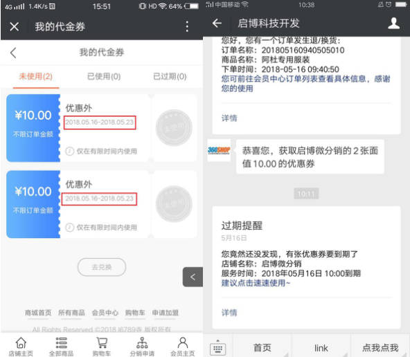操作步驟: 總部后臺→會員→會員列表→發放優惠券→手機微信端→會員主頁→我的代金券:優惠券到期提醒時間為凌晨3點(提前七天)。