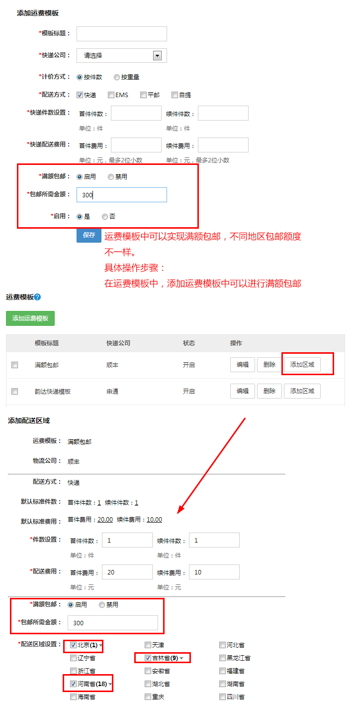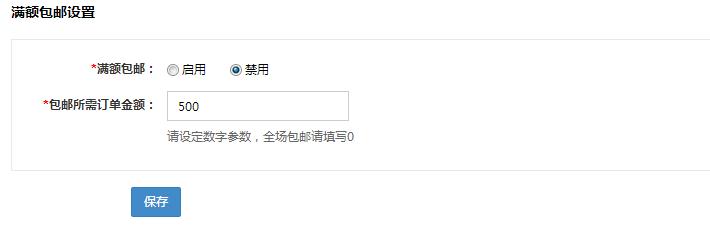 滿額包郵:設置買家訂單總額達到多少金額時可以進行包郵。開啟點擊保存生效。