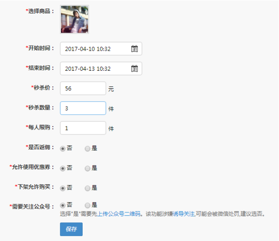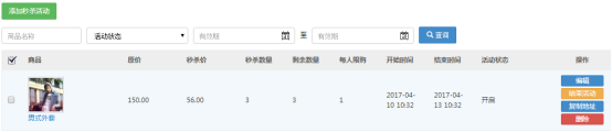 設(shè)置秒殺活動(dòng),點(diǎn)擊”添加秒殺活動(dòng)“按鈕,進(jìn)行活動(dòng)相關(guān)信息的設(shè)置,保存即可返回活動(dòng)列表進(jìn)行查看。如下圖所示: