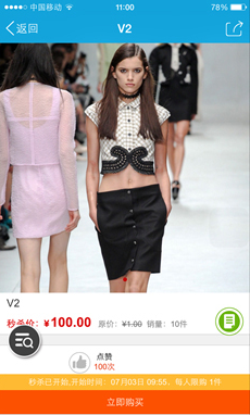 如果活動(dòng)已經(jīng)開始,活動(dòng)狀態(tài)就會(huì)顯示開啟,活動(dòng)操作中就會(huì)顯示“結(jié)束活動(dòng)”,手機(jī)端底部顯示”立即購買“按鈕。如果活動(dòng)未開始狀態(tài),活動(dòng)操作中就會(huì)顯示“開始活動(dòng)”;如果要結(jié)束活動(dòng),可以點(diǎn)擊結(jié)束活動(dòng)點(diǎn)擊。前端顯示效果如下圖所示:
