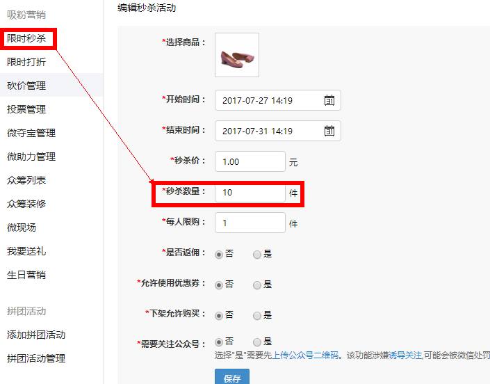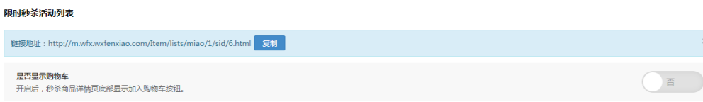 ·總部后臺(tái)→營銷→吸粉營銷→限時(shí)秒殺:秒殺活動(dòng)列表增加“是否顯示購物車”,開啟后,秒殺商品詳情頁底部顯示加入購物車按鈕。