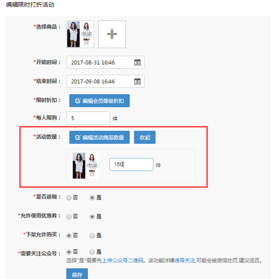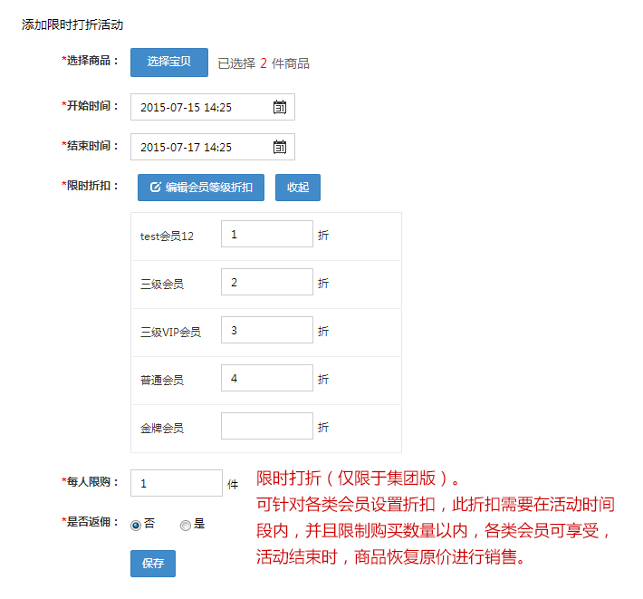 限時打折(僅限于集團版):可針對各類會員設置折扣,此折扣需要在活動時間段內,并且限制購買數量以內,各類會員可享受,活動結束時,商品恢復原價進行銷售